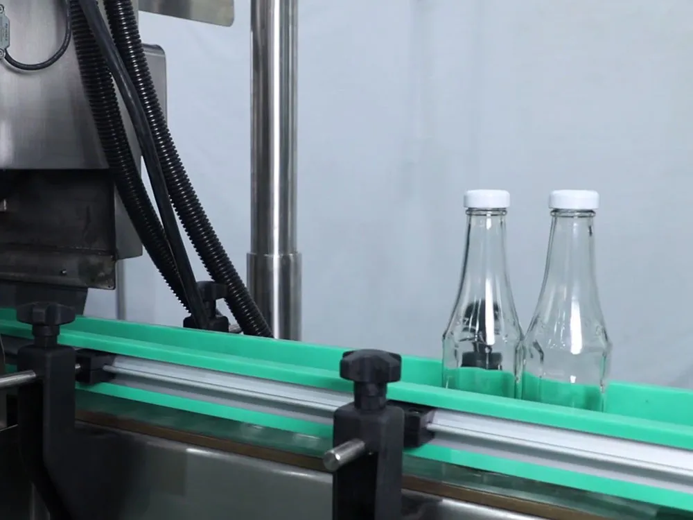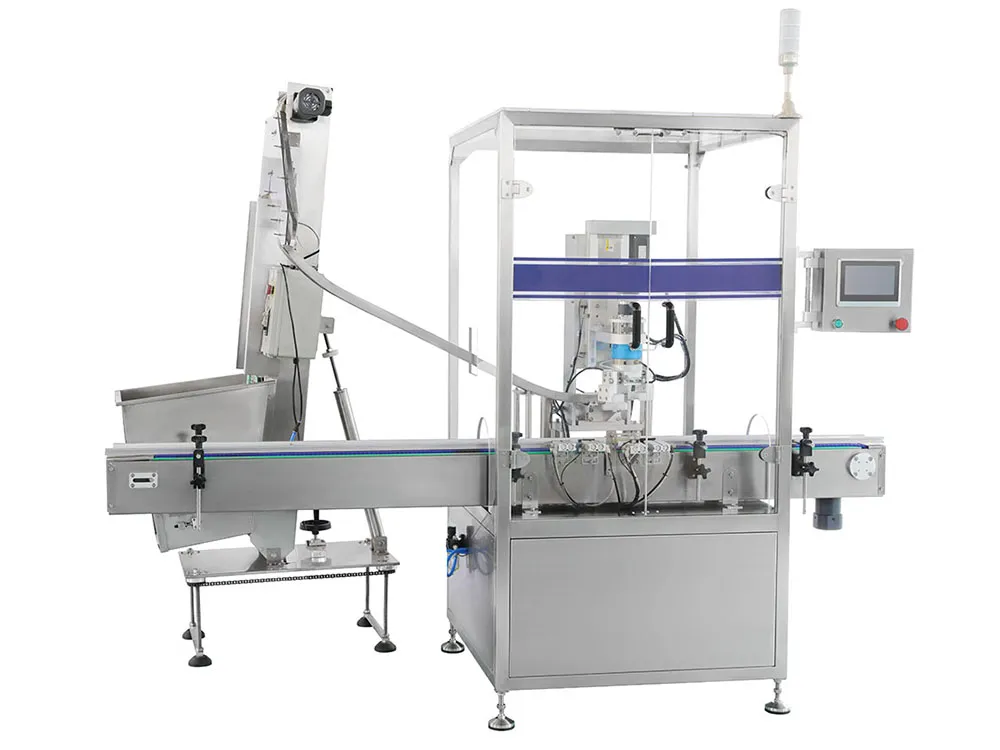 Nuestra taponadora automática de rosca supera las limitaciones de las taponadoras intermitentes tradicionales al ofrecer alimentación lineal de botellas, colocación automática de tapas y taponado continuo. Incorpora un innovador sistema de caída de tapas por elevación, eliminando el ruido de los sistemas vibratorios y mejorando la eficiencia. Su diseño altamente compatible permite el manejo de diversos tamaños de botellas y tapas con ajustes simples. Ideal para industrias farmacéuticas, alimentarias y cosméticas, garantiza un taponado preciso, rápido y confiable.